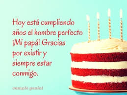Papá siempre has sido un hombre tan cariñoso mi amigo mi guardián mi profesor mi consejero. Un hombre dedicado y verdadero que siempre me ha cuidado y todavía me cuida incluso en mi. Unas tres palabras simples bonitas y sinceras directas al corazón de tu padre porque tú deseas de verdad que sea muy feliz toda su vida pero en especial el día de su cumpleaños.